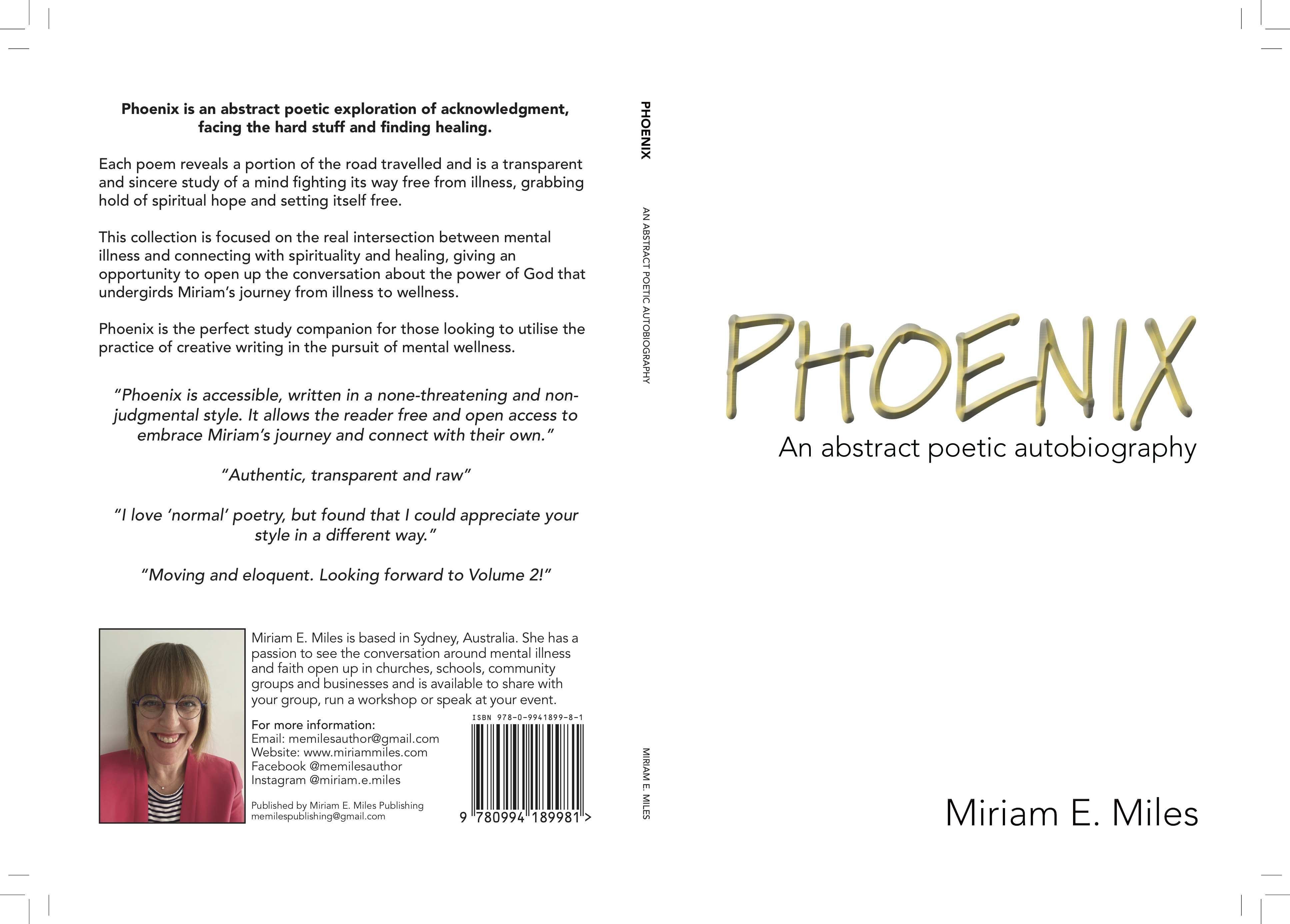 Phoenix is an abstract poetic exploration of acknowledgment, facing the hard stuff, and finding healing. Each poem reveals a portion of the road travelled and is a transparent and sincere study of a mind fighting its way free from illness, grabbing hold of spiritual hope, and setting itself free.